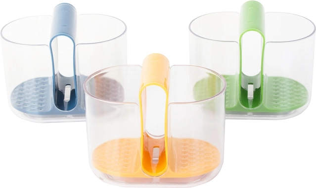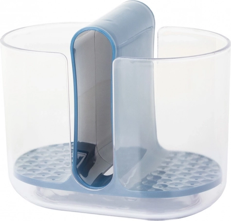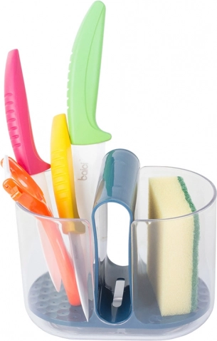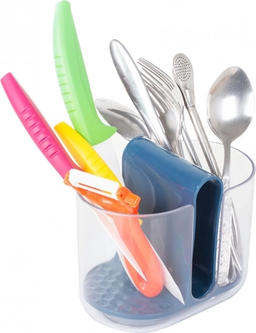 Los compartimentos laterales están destinados a los cubiertos, mientras que el compartimento central es ideal para el estropajo o cepillo. Las aberturas integradas permiten que el agua de los cubiertos caiga al fondo, garantizando un secado rápido. Este escurridor se puede extraer fácilmente, lo que facilita el vaciado y el mantenimiento.