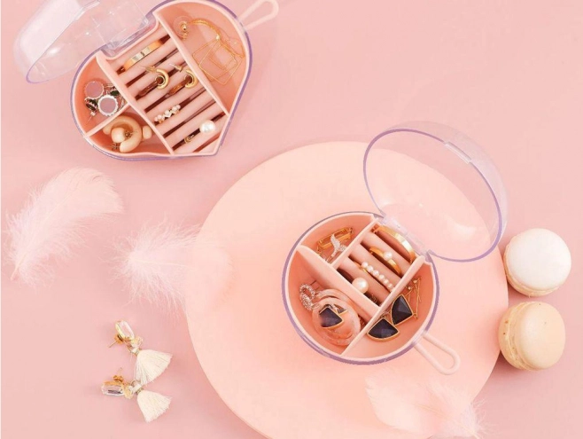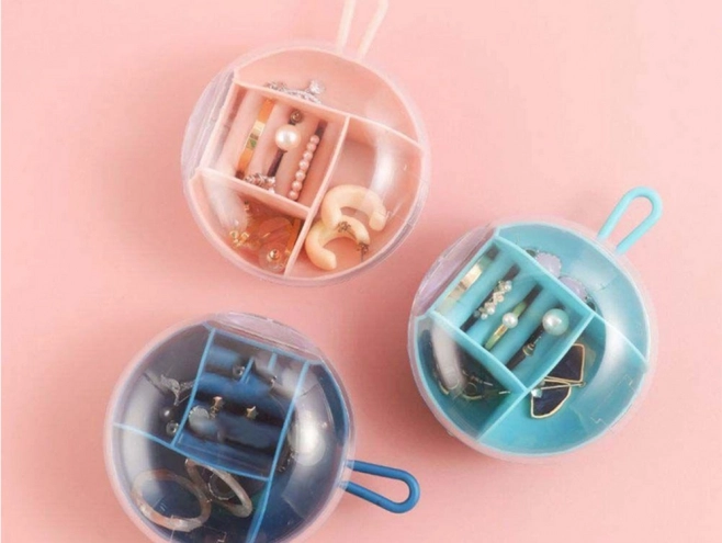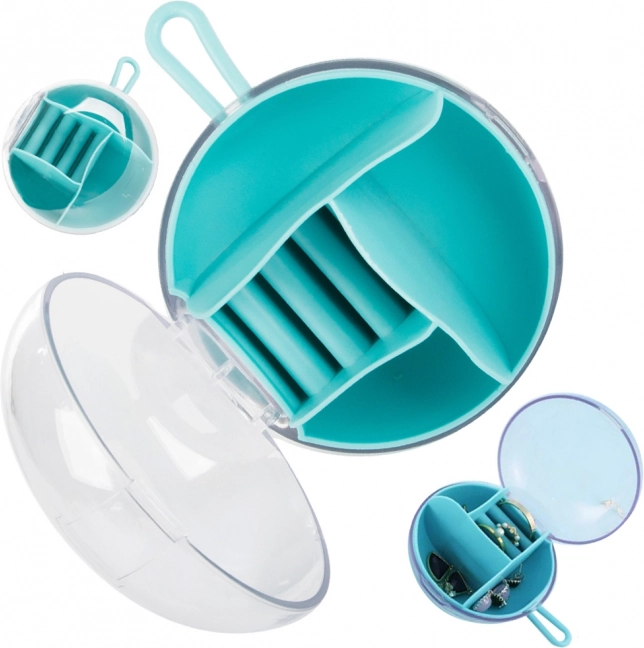 Este elegante joyero de viaje ayuda a mantener tus objetos de valor seguros y bien organizados. La caja redonda de plástico resistente cuenta con distintos tipos y tamaños de compartimentos, incluidos soportes para anillos, para que cada pieza tenga su lugar. La tapa transparente permite una revisión rápida sin abrir y el asa de goma asegura un transporte cómodo.
