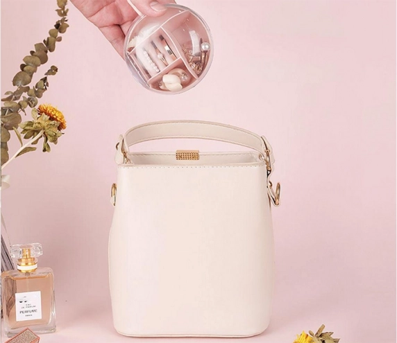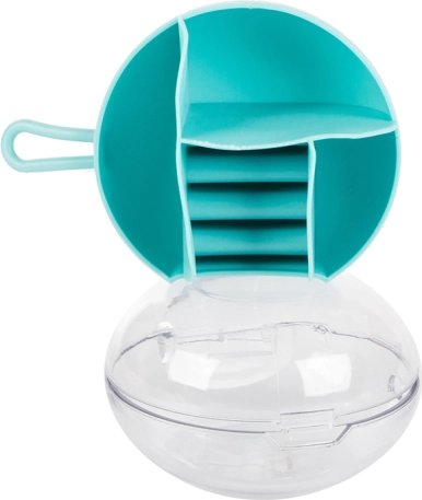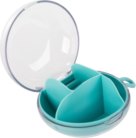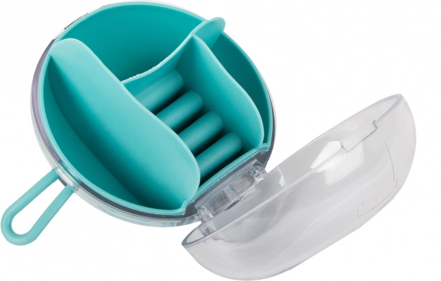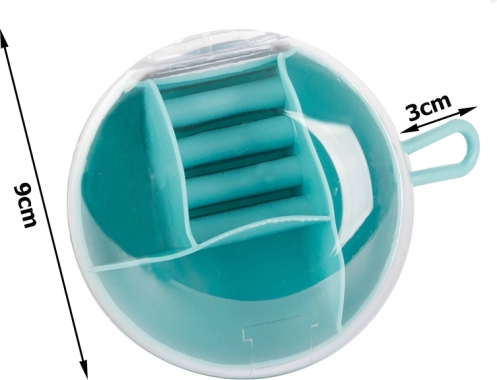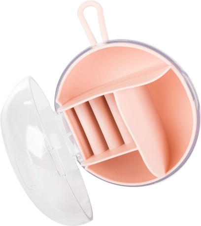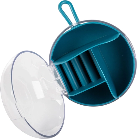 Gracias al organizador central extraíble, puedes usar parte de los compartimentos de forma independiente. Sus dimensiones compactas, diámetro de 9 cm y altura de 6 cm, lo convierten en la opción ideal para el bolso, la maleta o el tocador. Colores disponibles: rosa, azul marino, verde.