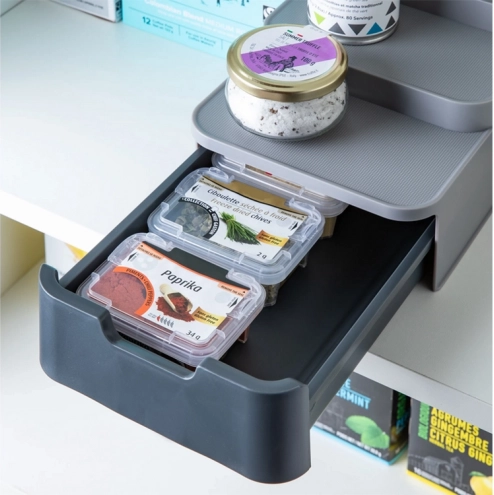El cajón integrado alberga bolsitas, tubos, recargas de especias o pequeños cosméticos y mantiene todo ordenado en un solo lugar.