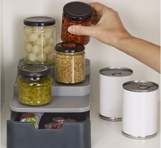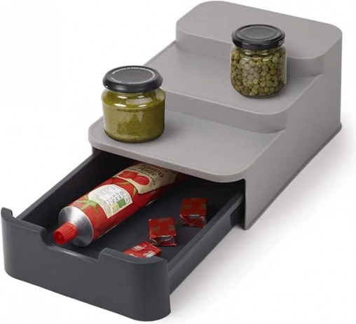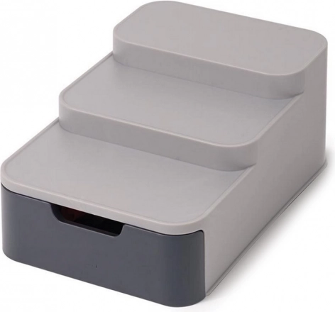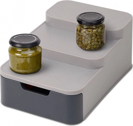 Este organizador compacto aprovecha eficazmente el espacio de tu despensa o armario. Sus tres niveles mejoran la visibilidad de frascos y latas en la fila trasera, mientras que el cajón extraíble guarda bolsitas, tubos y otros pequeños objetos. El resistente plástico en color gris se limpia fácilmente y encaja a la perfección en una cocina moderna.