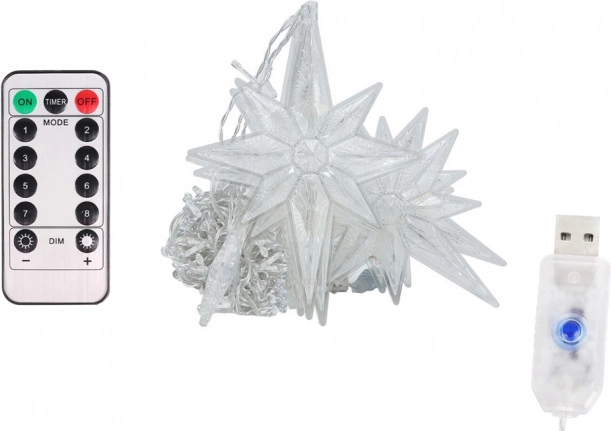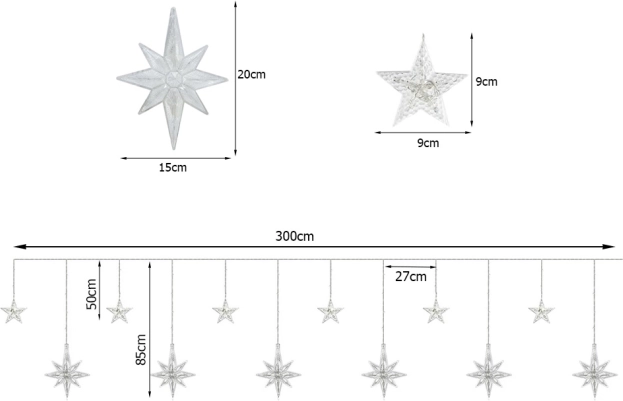 La cortina incluye 6 estrellas grandes y 6 estrellas pequeñas, con una longitud total de 5 m. Puedes elegir entre 8 programas de luz diferentes para crear el ambiente deseado mediante el control remoto incluido.