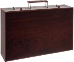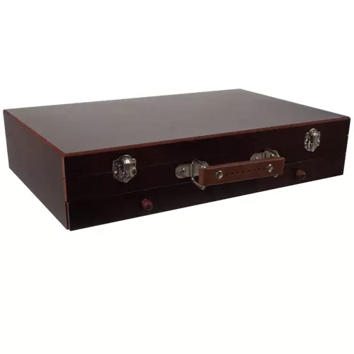 Gracias al práctico maletín de madera con asa y cierre seguro, transportar este set es fácil y cómodo. Con los compartimentos bien organizados, siempre tendrás acceso sencillo a cada herramienta, que permanecerá en orden y claramente dispuesta.