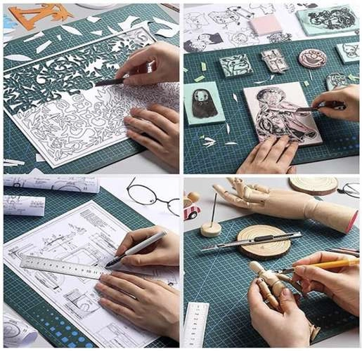 Práctica alfombrilla de corte autorregenerativa en formato A3 para cortes precisos y seguros de papel, cartón, láminas o telas. Gracias a su construcción multicapa, las incisiones se cierran solas tras el corte, por lo que la base soporta un uso prolongado. La impresión a doble cara con escalas y líneas auxiliares facilita el trabajo y su superficie antideslizante garantiza la estabilidad durante el corte. Ideal para modelistas, diseñadores, aficionados y oficina.