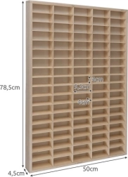 La construcción bien pensada permite retirar y reorganizar los divisores, de modo que puedes crear fácilmente las dimensiones necesarias para modelos de distintos tamaños. El estante está diseñado para colgarse en la pared (incluye kit de montaje y 2 colgadores), pero también puede colocarse sobre una cómoda o una mesa.