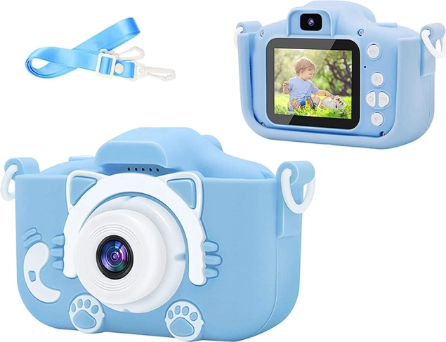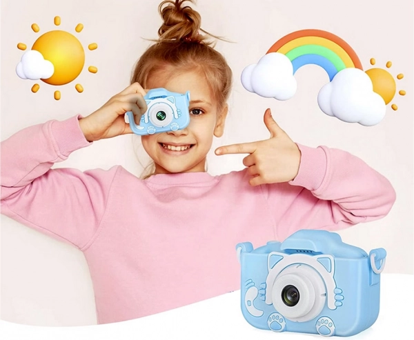 La cámara está diseñada para un agarre cómodo en manos infantiles e incluye una funda de silicona con diseño de gatito que protege contra caídas.